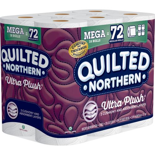 Indulge in Quilted Northern's Ultra Plush toilet paper, featuring innovative 3-layer construction with the exclusive Innerlux technology. Two ultra-soft layers provide cloud-like comfort, while the third absorbent layer ensures dependable performance. Each mega roll contains 284 premium sheets (4" length) for long-lasting use.